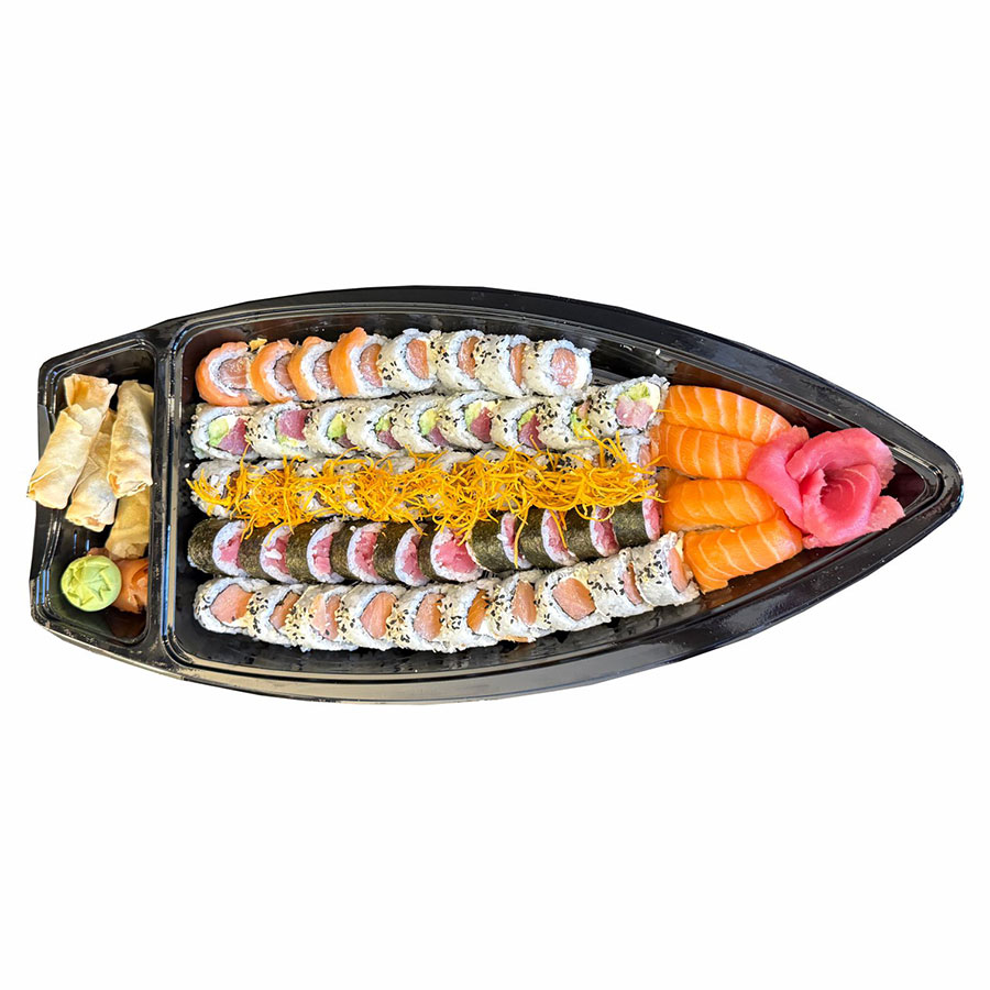 Cada barco va con 4 sets de palitos y salsa de soja, 1 salsa maracuya y 1 salsa teriyaki.
