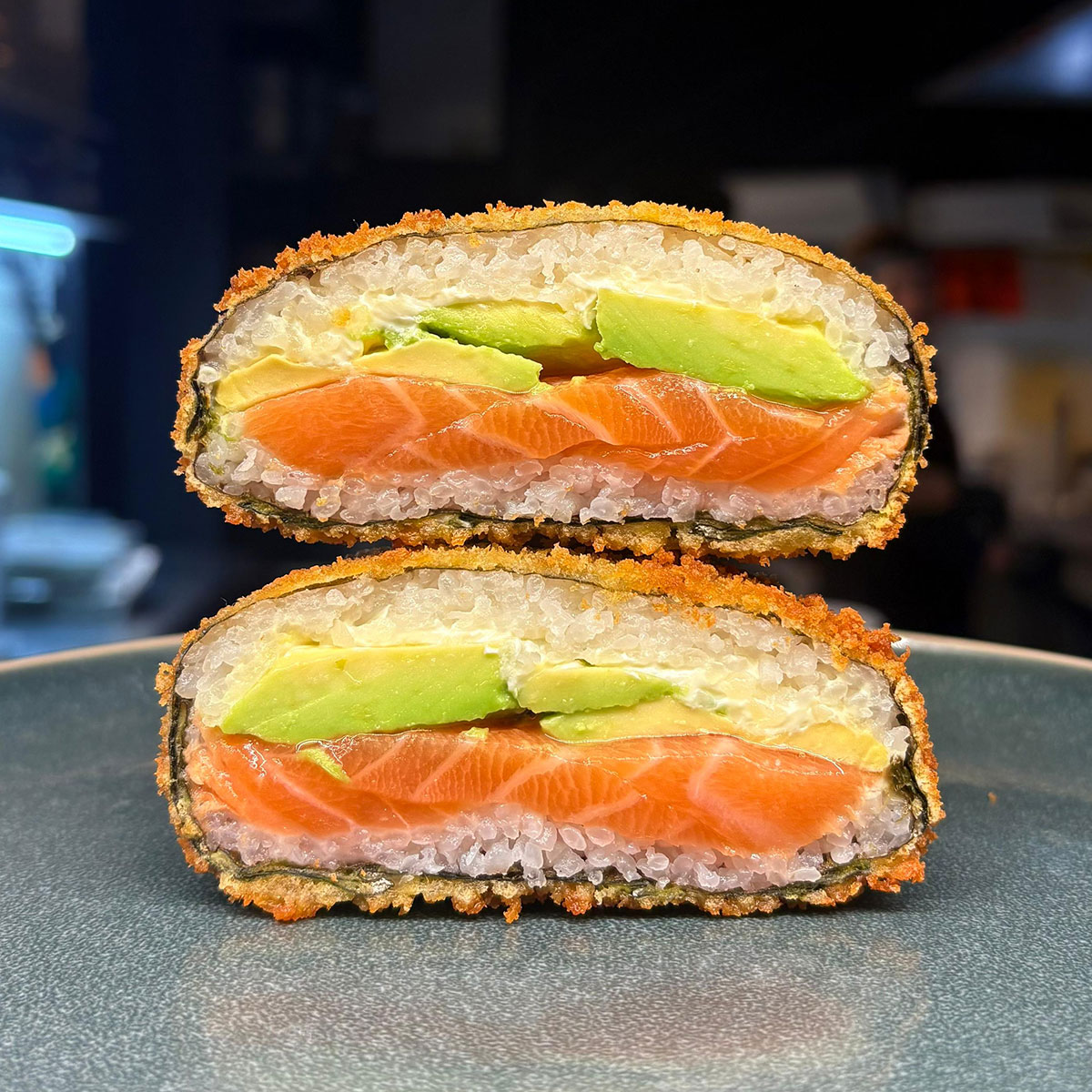 «Pan» a base de arroz, salmón fresco, queso phila y palta. Podes pedirla sola, con papas fritas o boniatos fritos.